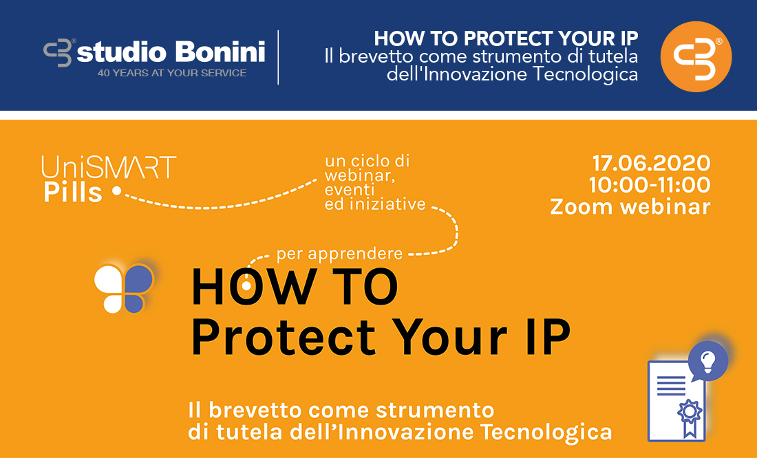 Il prossimo appuntamento con le UniSMART Pills è Mercoledì 17 giugno alle ore 10:00 con lo Zoom webinar di Paolo Marchioro, European Patent Attorney presso Studio Bonini, uno dei partner della UniSMART Community.
