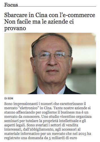 Sono impressionanti i numeri che caratterizzano il mercato “elettronico” in Cina. Tante nostre aziende si stanno affacciando per coglierne il business ma è un mercato da conoscere. Uno studio vicentino organizza seminari per tutelare la proprietà intellettuale e gli aspetti legali. Sono svariati i settori di vendita interessati, dall’abbigliamento, agli accessori al materiale informatico per un mercato che nel 2015 ha registrato una domanda da 5 miliardi di euro.
